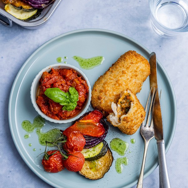 Bak dem i ovn i ca 10 min på 225°C sammen med cherrytomat i passe serveringsbunter.