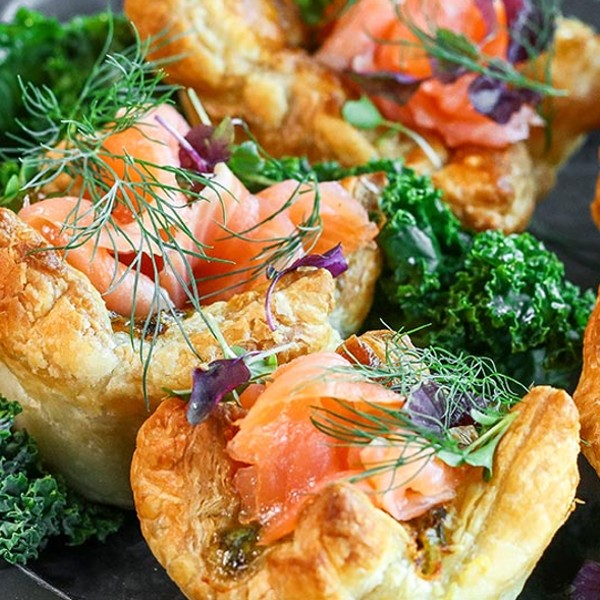 8. Server minipaiene med røkelaks og en dillkvast på toppen.
