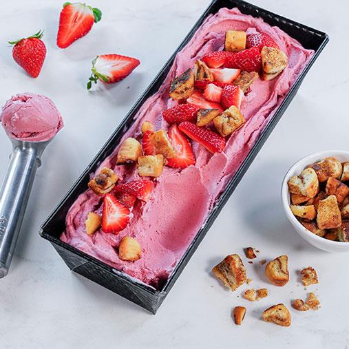 - Ha jordbærpuré, kremost, kremfløte og vaniljepulver i en blender og miks godt sammen.