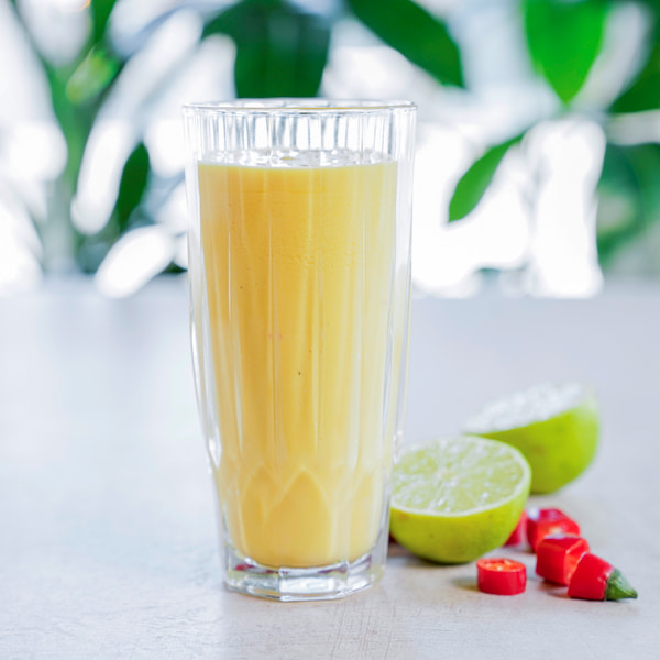 - Ha yoghurt, appelsinjuice, hakket chili og presset limesaft i en blender og bland sammen.