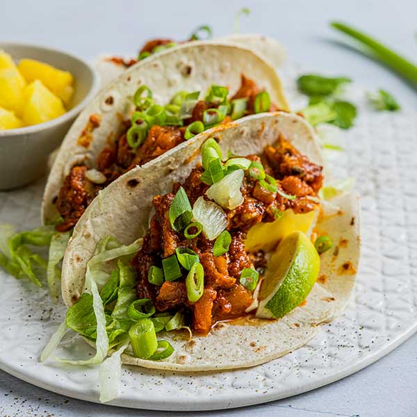 - Stek veganske biter til de er sprø. Ha over sausen og vend dette inn, serves i hvetetortillas med litt hakket ananas og gressløk.