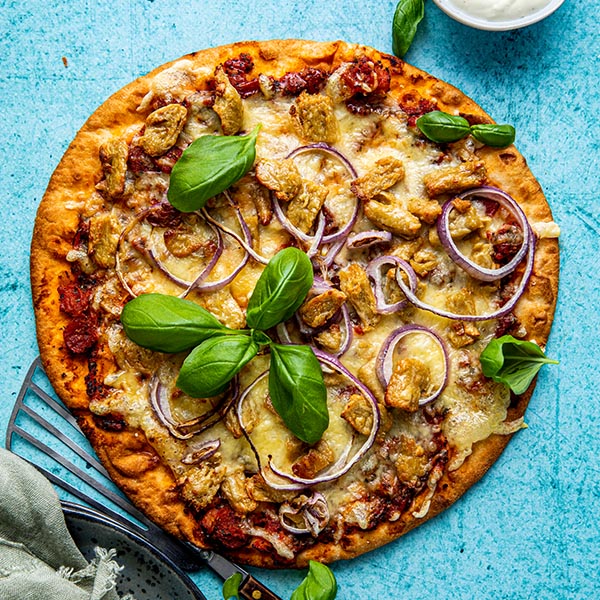 Tips! Topp gjerne pizzaen med fersk basilikum.