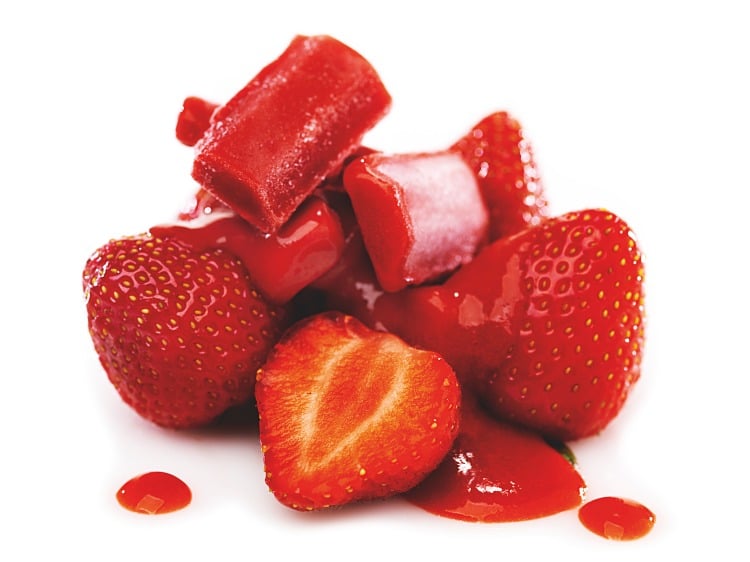 Passerte jordbær. Puréen er varmebehandlet og løsfryst i biter.