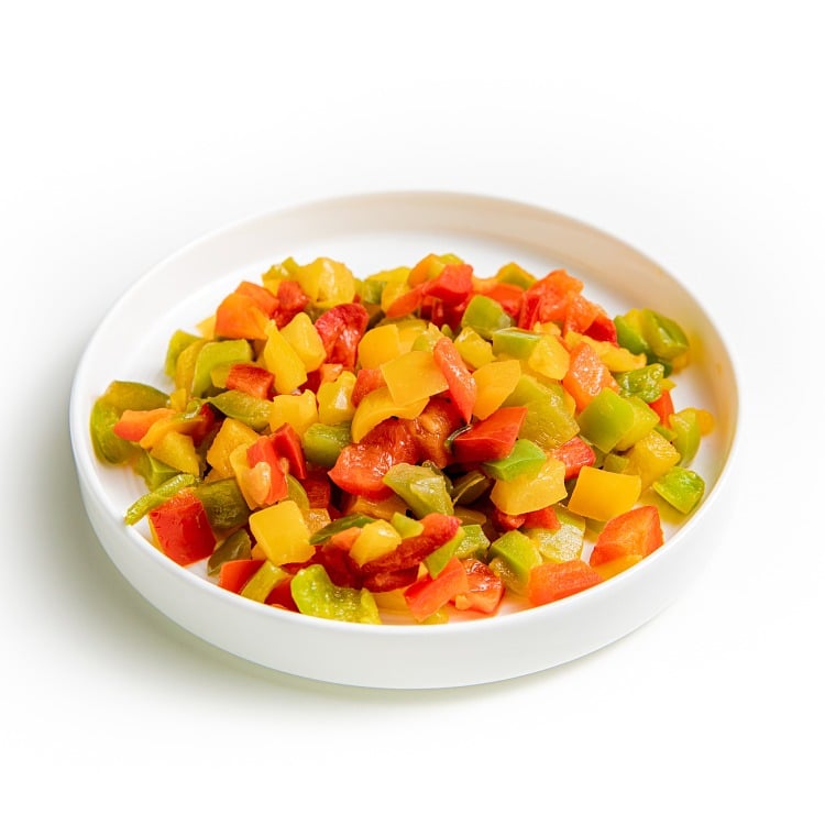 Forvellet rød, grønn og gul ternet paprika som kan tilsettes pizza, gryteretter og varmretter direkte fra dypfryst tilstand.