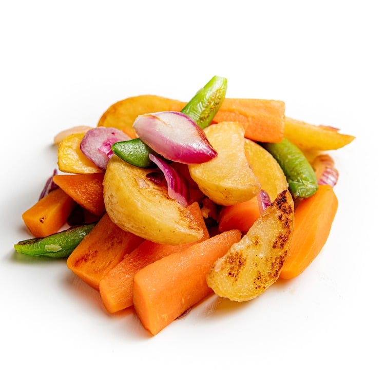 Gulrot, potet 28% (potet, rapsolje, druesukker), rødløk 20%, sukkererter, pastinakk.
