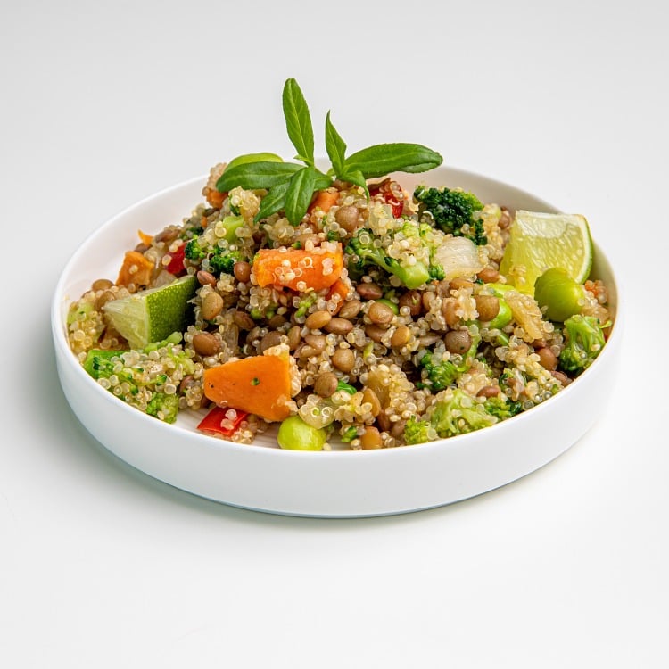 Kokt quinoa 33 % (vann, quinoa), linser 21 %, brokkoli 17 %, stekt løk 7 % (løk, solsikkeolje), grillet søtpotet 5%, erter 5 %, rød paprika 5 %, SOYA bønne 5 %, solsikkeolje, salt, svart pepper.